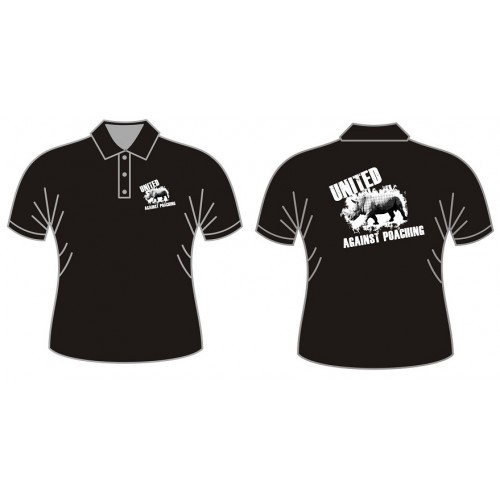 Heavyweight cotton rich golf shirts. Rhino image on front left pocket as well as on the back of the shirt. Wording on the shirt: United against poaching